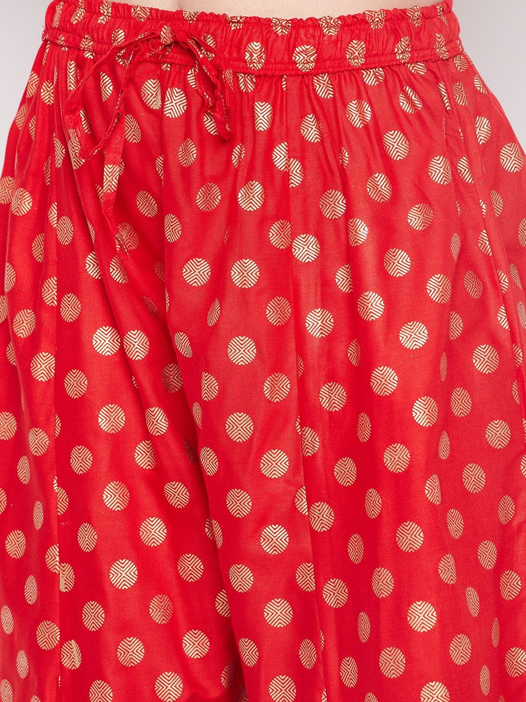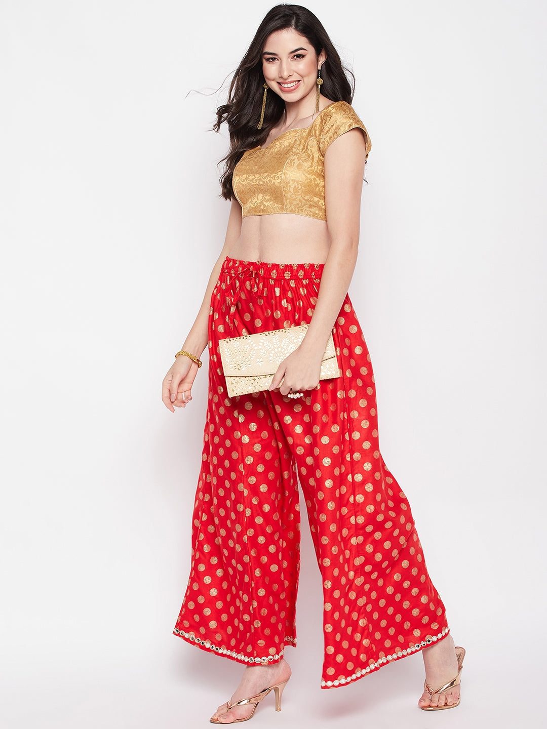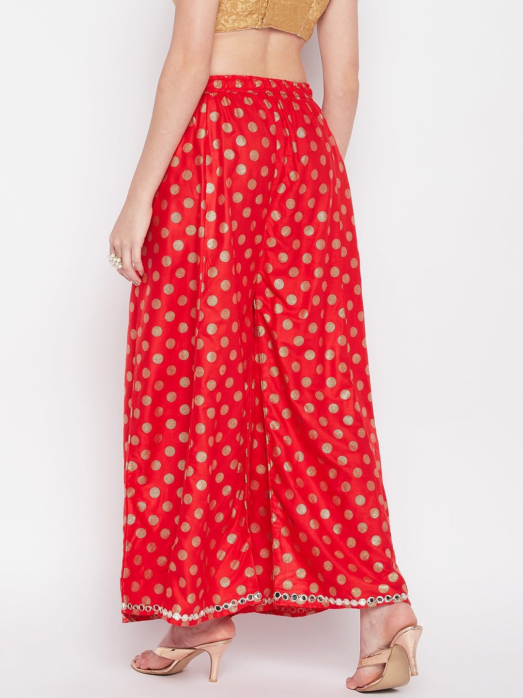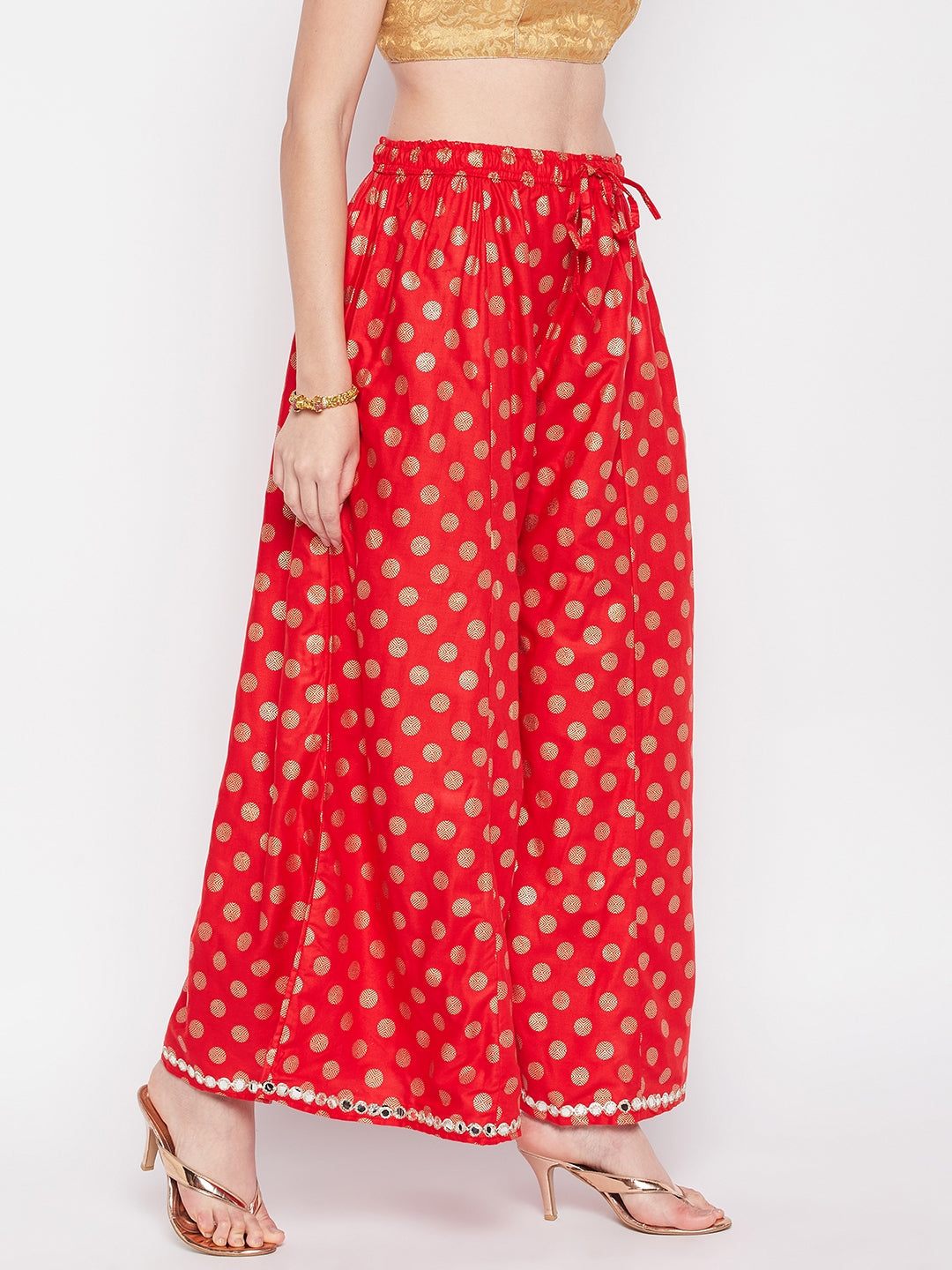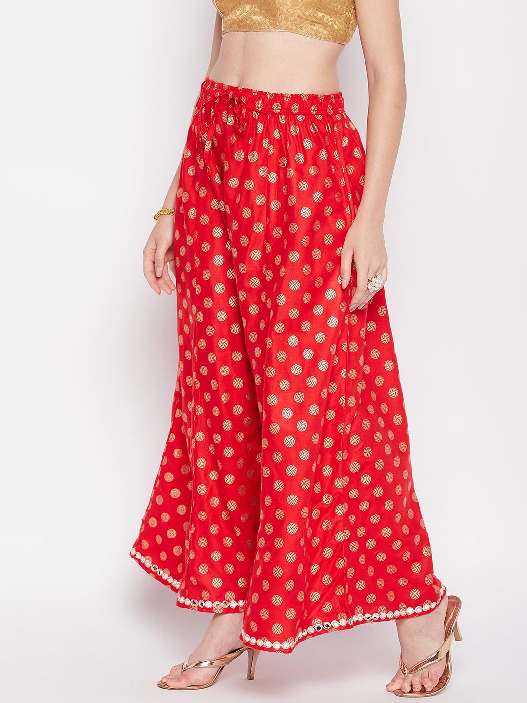 Red polka dot rayon sharara with embellished hem and elasticated waistband.