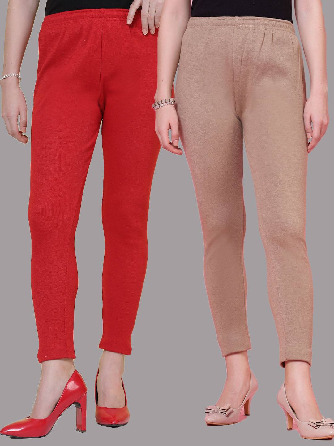 Red & Dark Fawn Solid Woolen Leggings (Pack of 2)