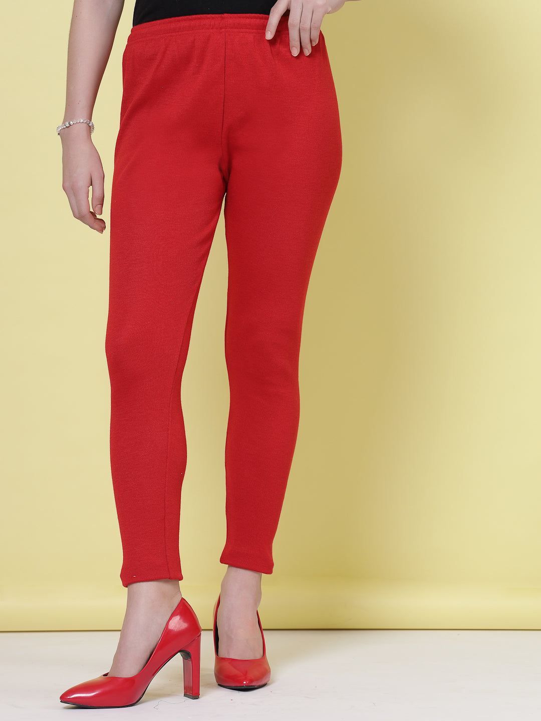 Red and dark fawn solid woolen leggings with elasticated waistband and drawstring closure.