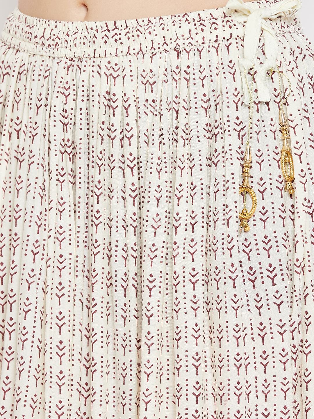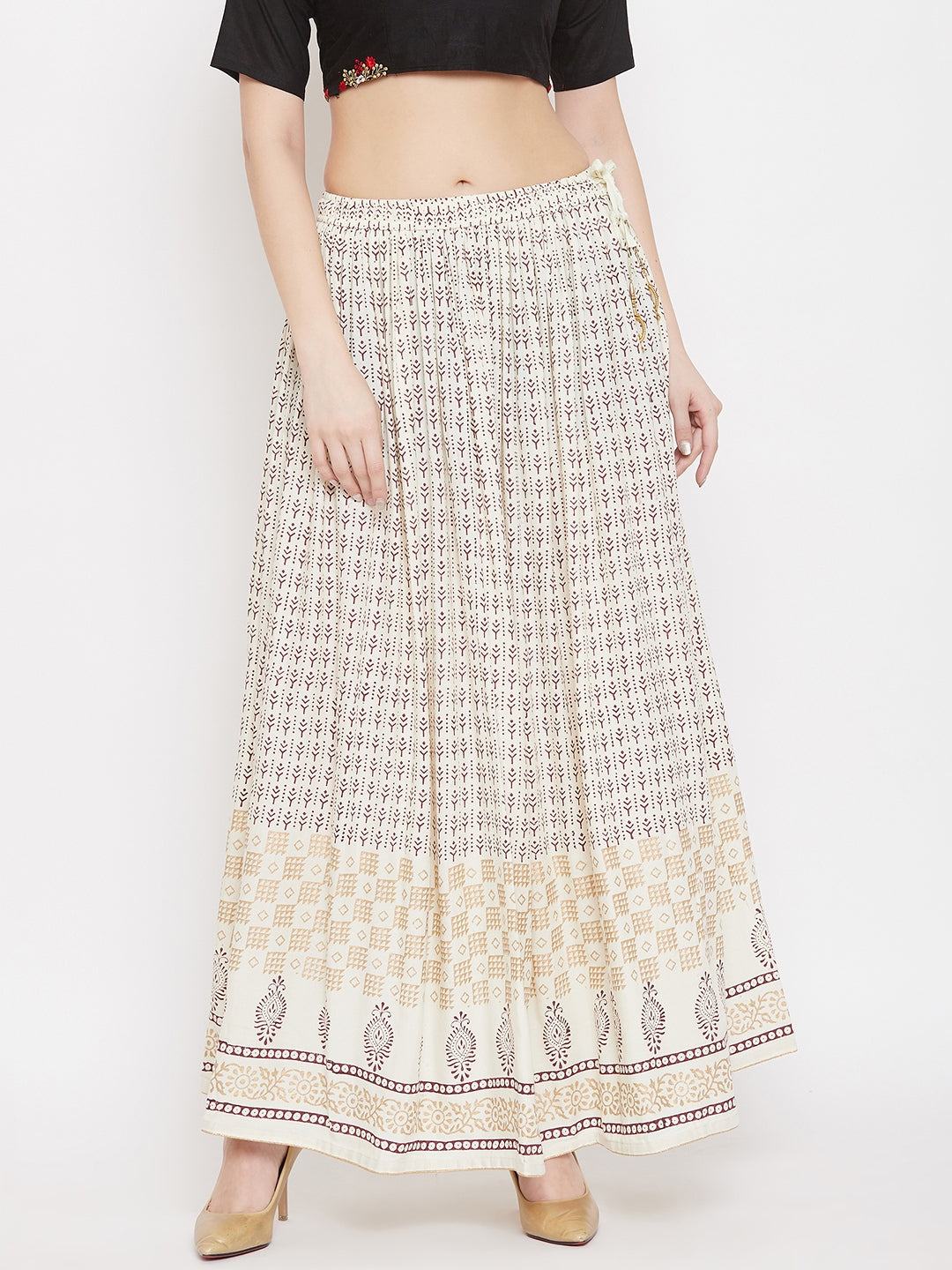 Cream printed rayon skirt for women, flared design from Clora, perfect for style and comfort.