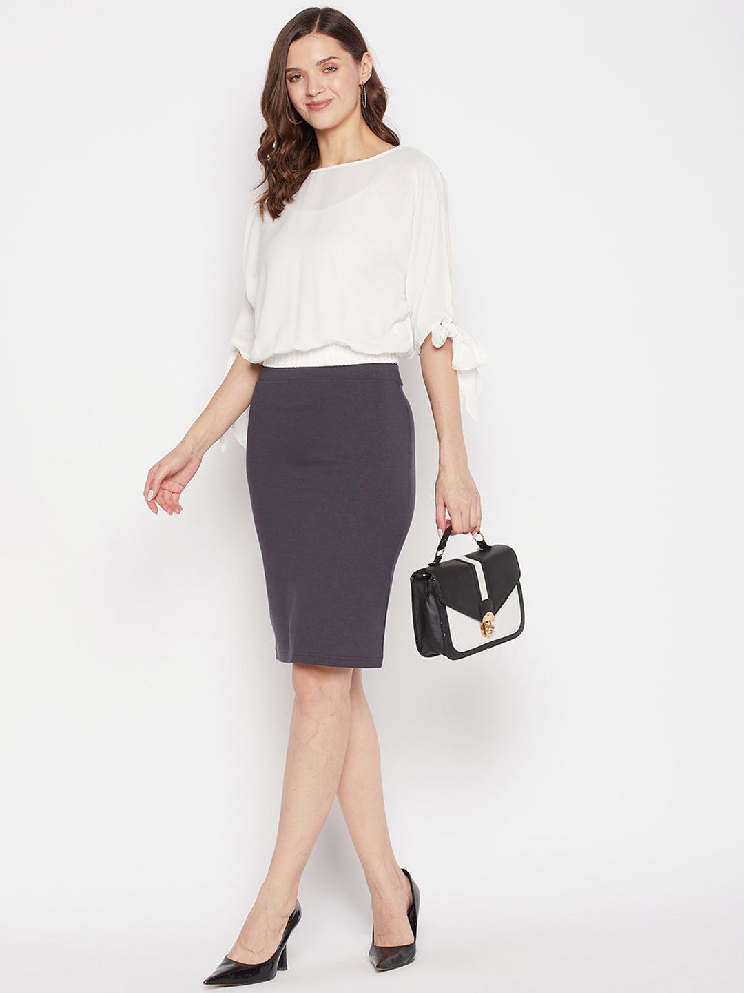 Grey skirt solid pencil skirt with back slit and straight hem.