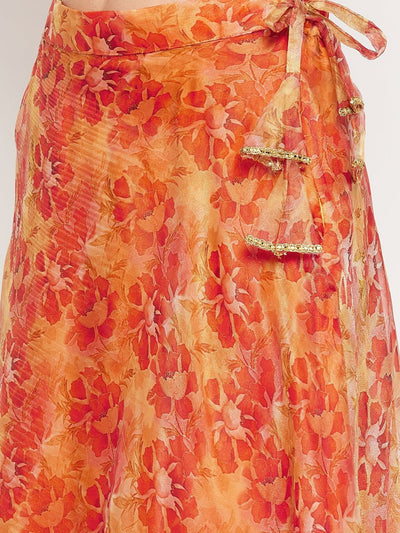 Orange Floral Printed Organza Skirt