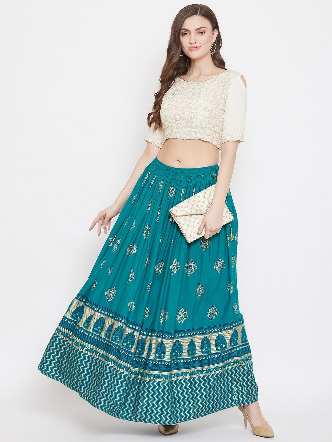 Turquoise flared printed maxi skirt with intricate design details in rayon fabric.
