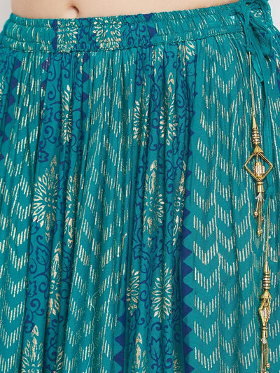 Turquoise printed rayon maxi skirt with a flared design for women.