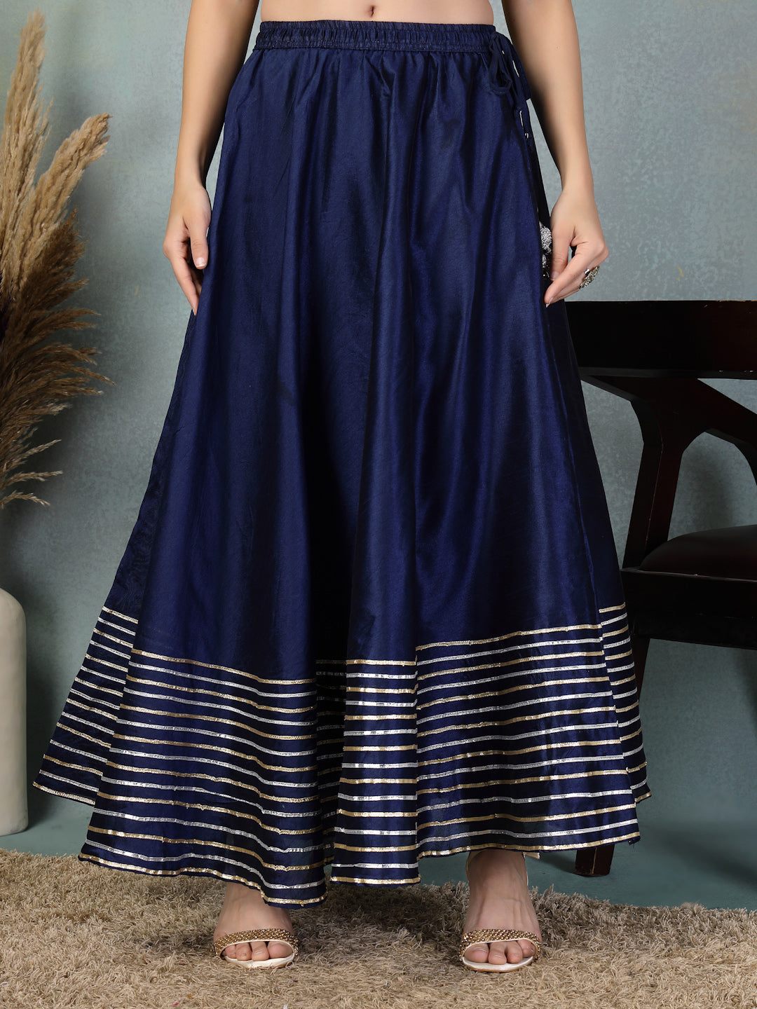 Navy blue gotta patti Chanderi silk flared skirt with drawstring and traditional Indian design