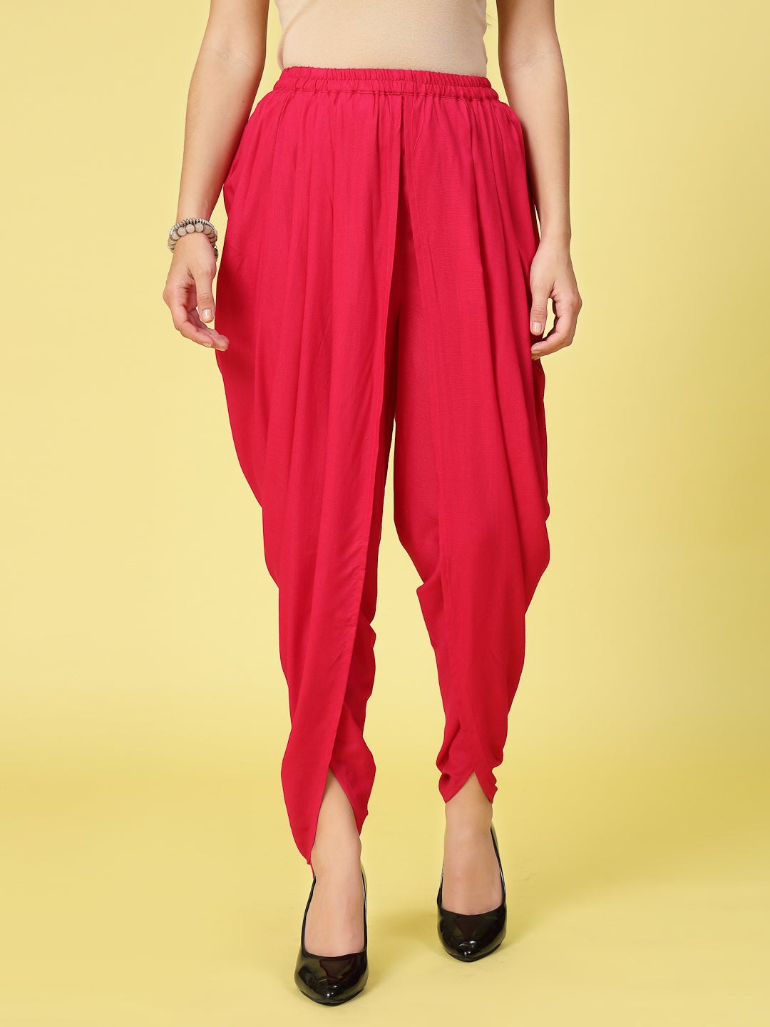 Women solid rayon dhoti salwar with gathered pleats and elastic waistband.