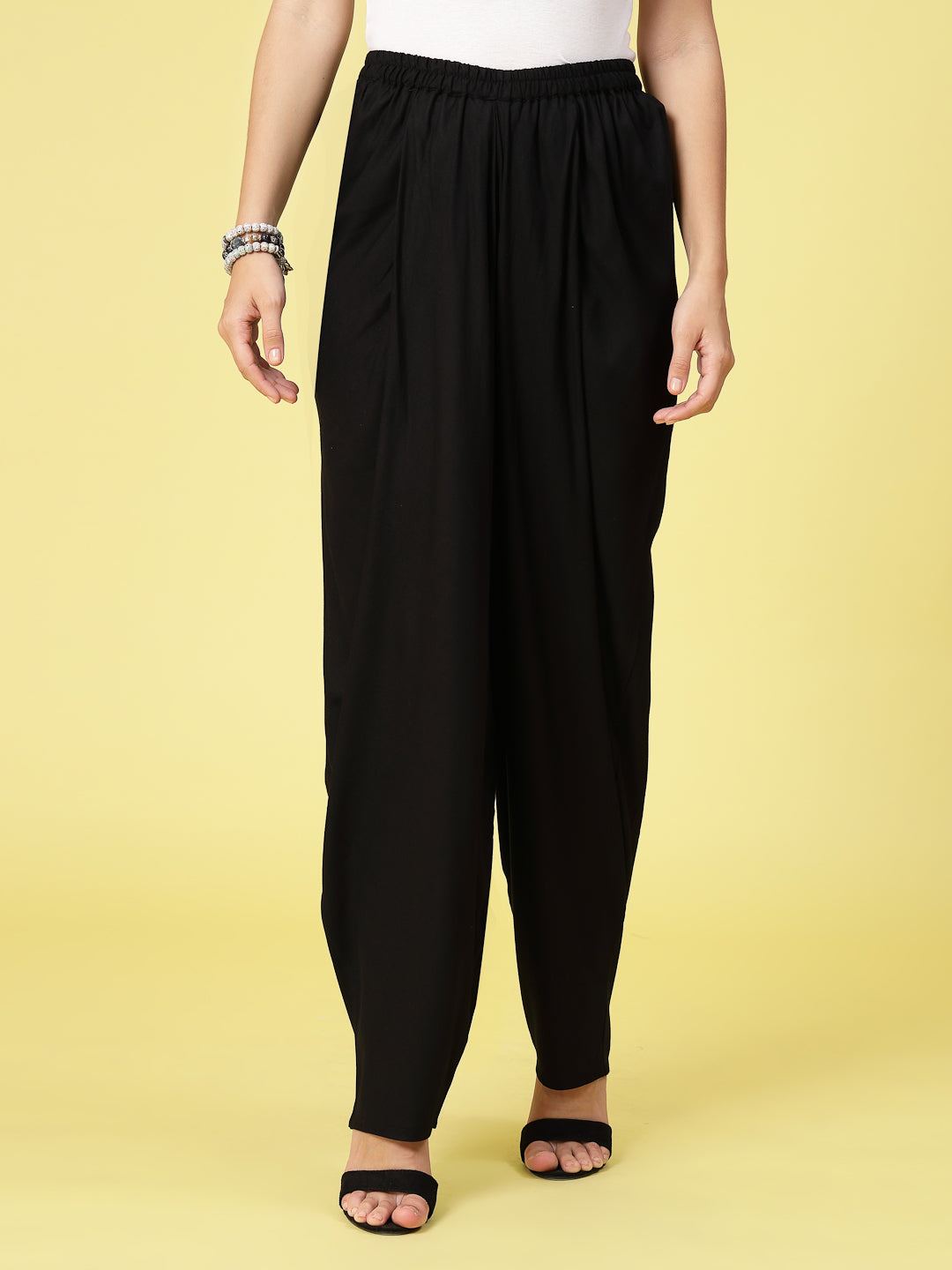 Women wearing solid black rayon dhoti salwar with elasticated waistband, styled with a white top, holding a handbag.